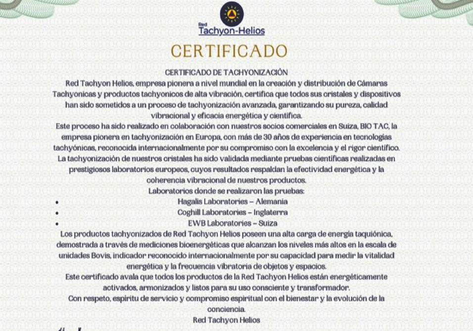 Este certificado garante que todos os produtos da Tachyon Helios Network são energeticamente ativado, harmonizado e pronto para uso consciente e transformador.